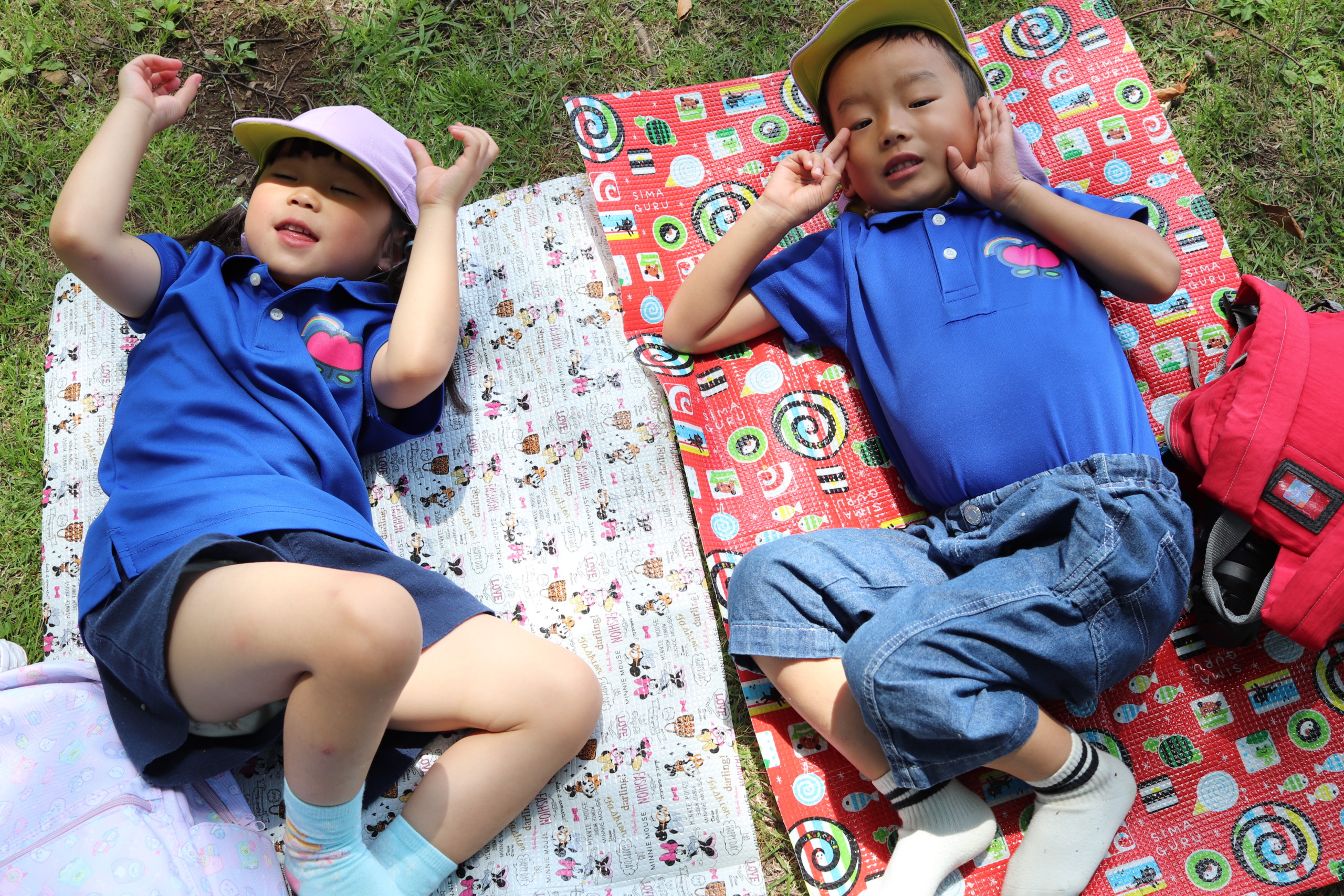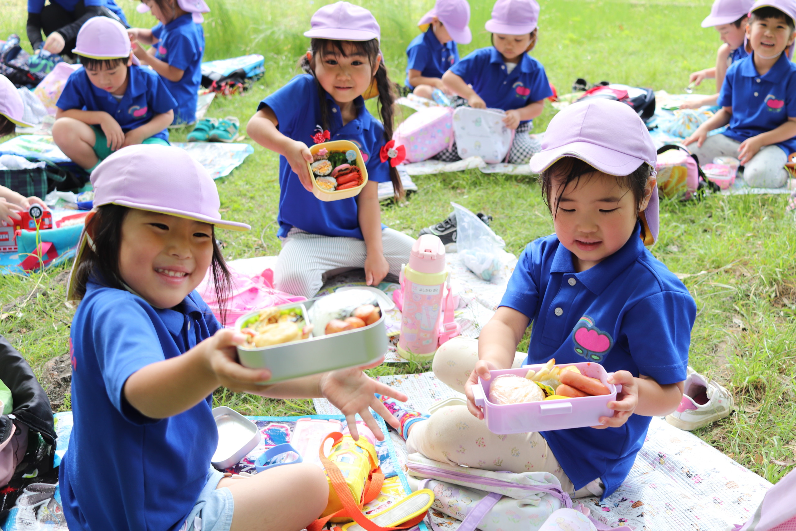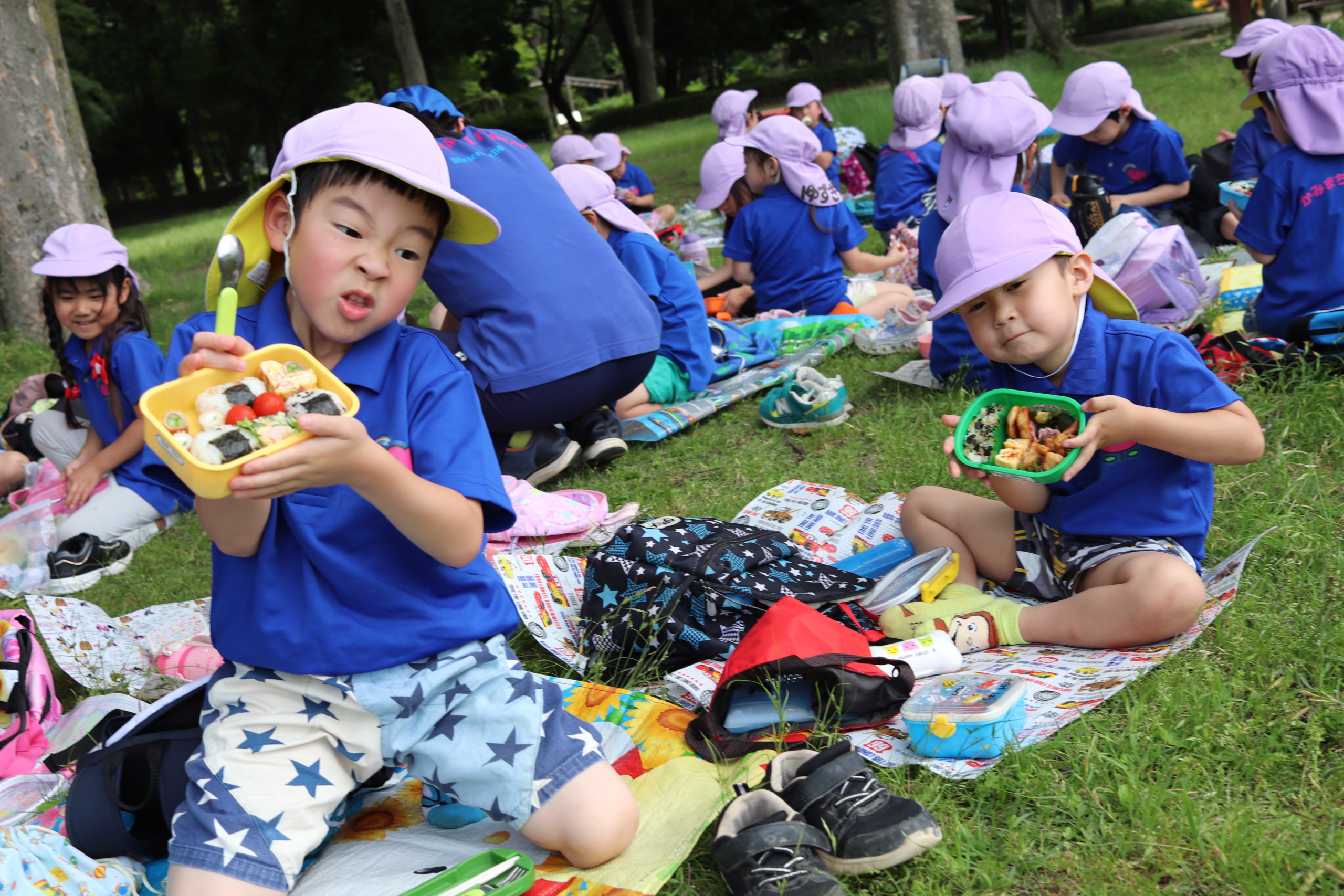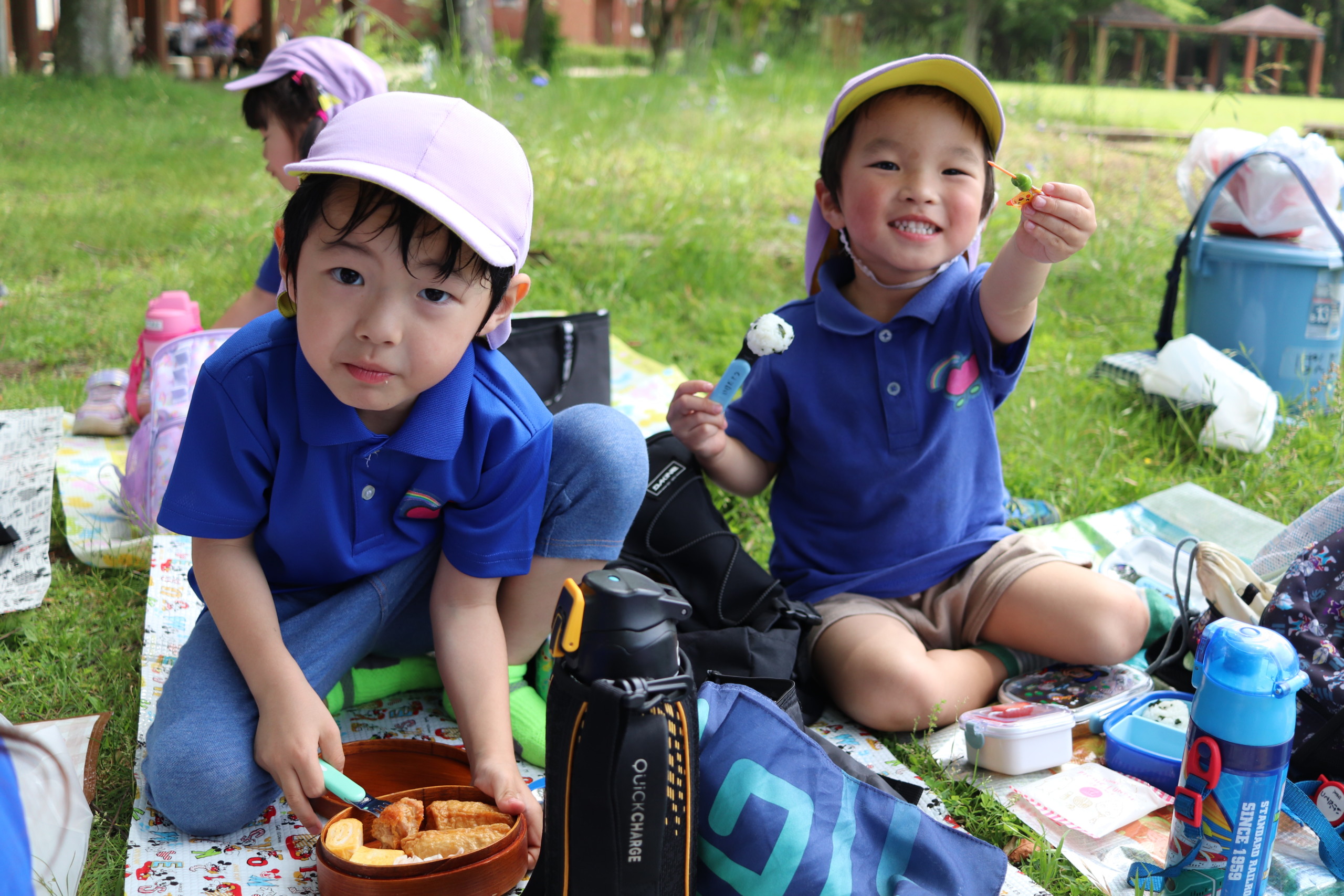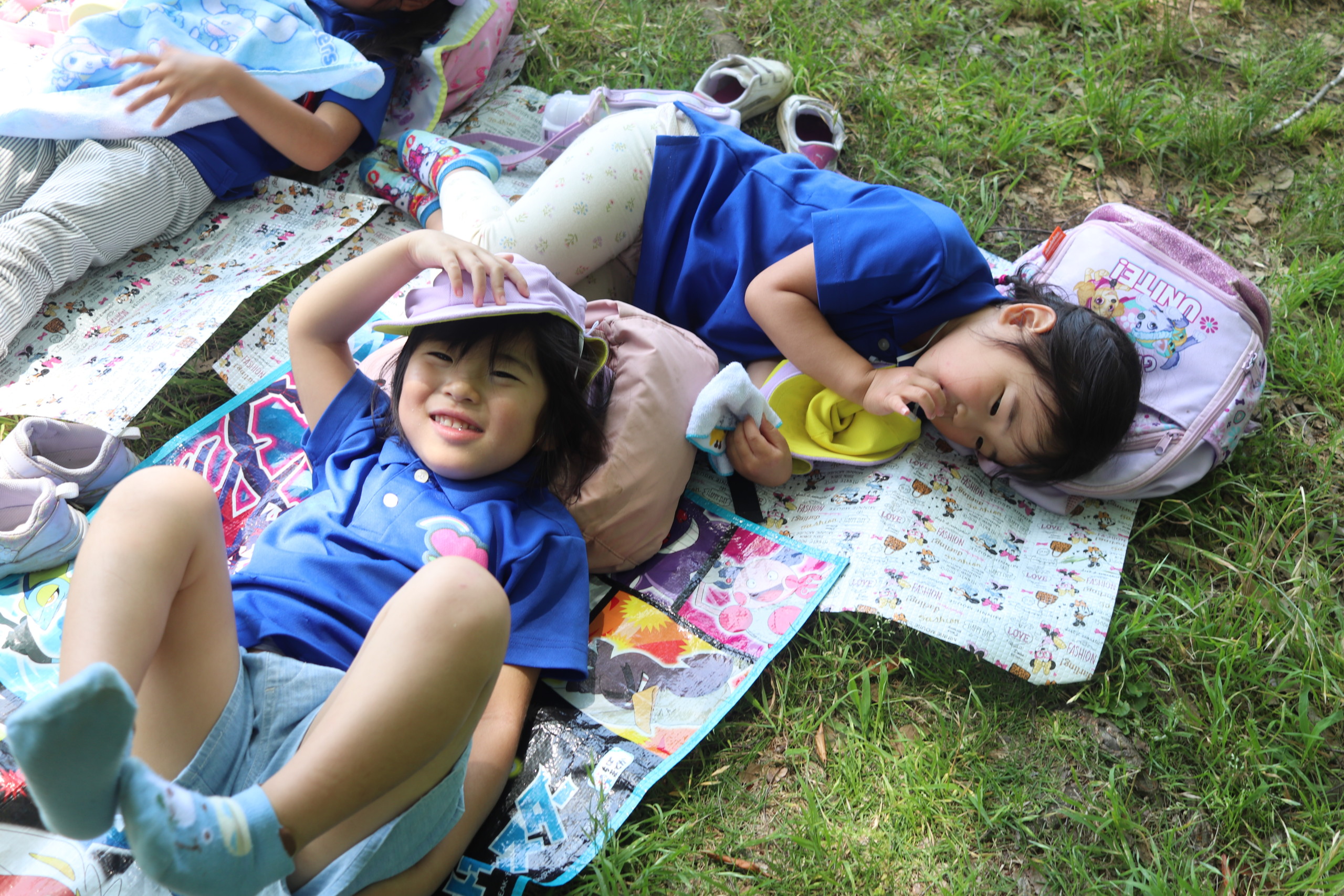 お待ちかねのお弁当TIME💕遊んでいる時にも「早くお弁当たべたーい!」と楽しみにしていました!仲良しのお友だちとお外で食べる愛情いっぱいのお弁当は、格別ですね✨食べ終わった後は、気持ちの良い木陰でごろんと休憩するお友だちもいましたよ!