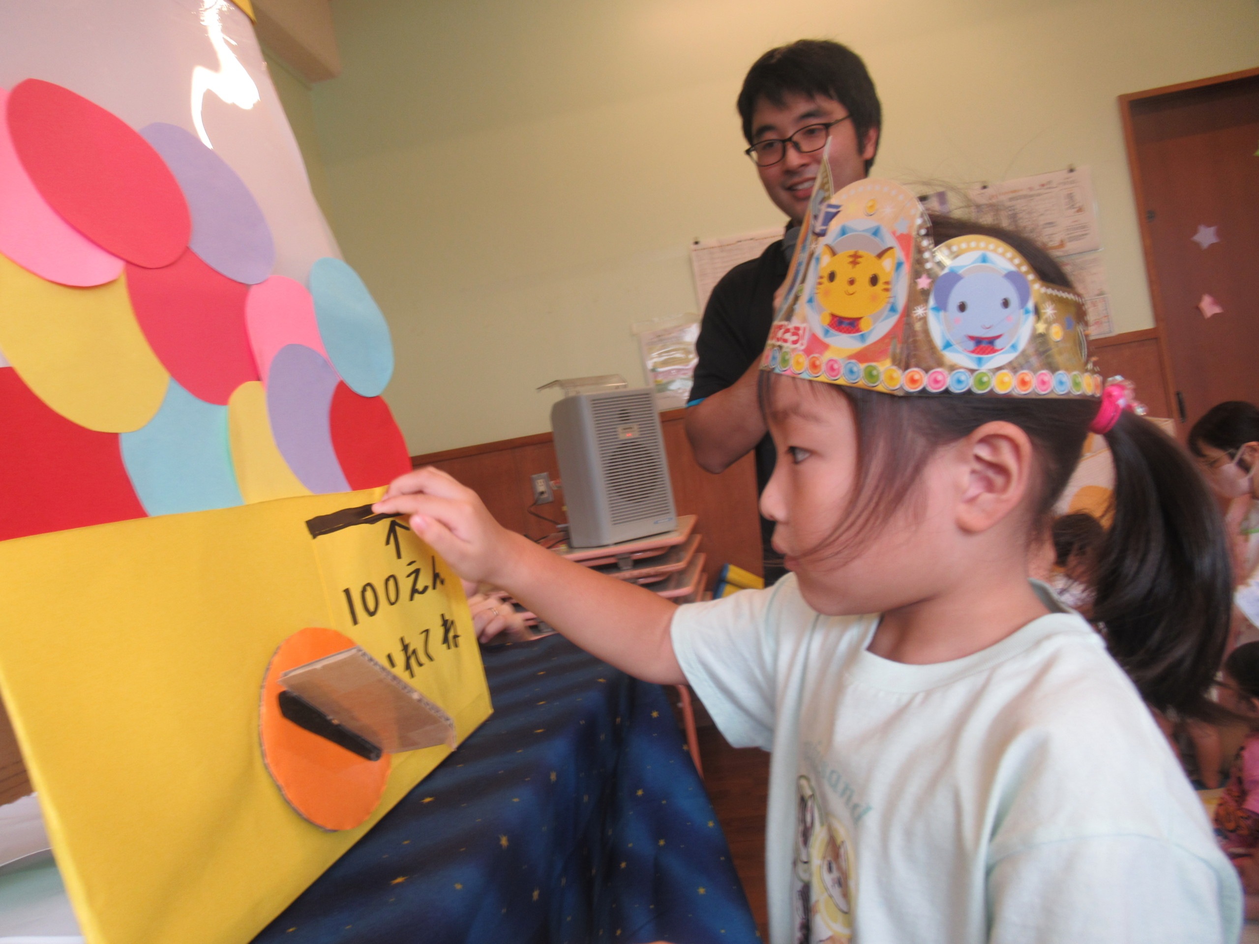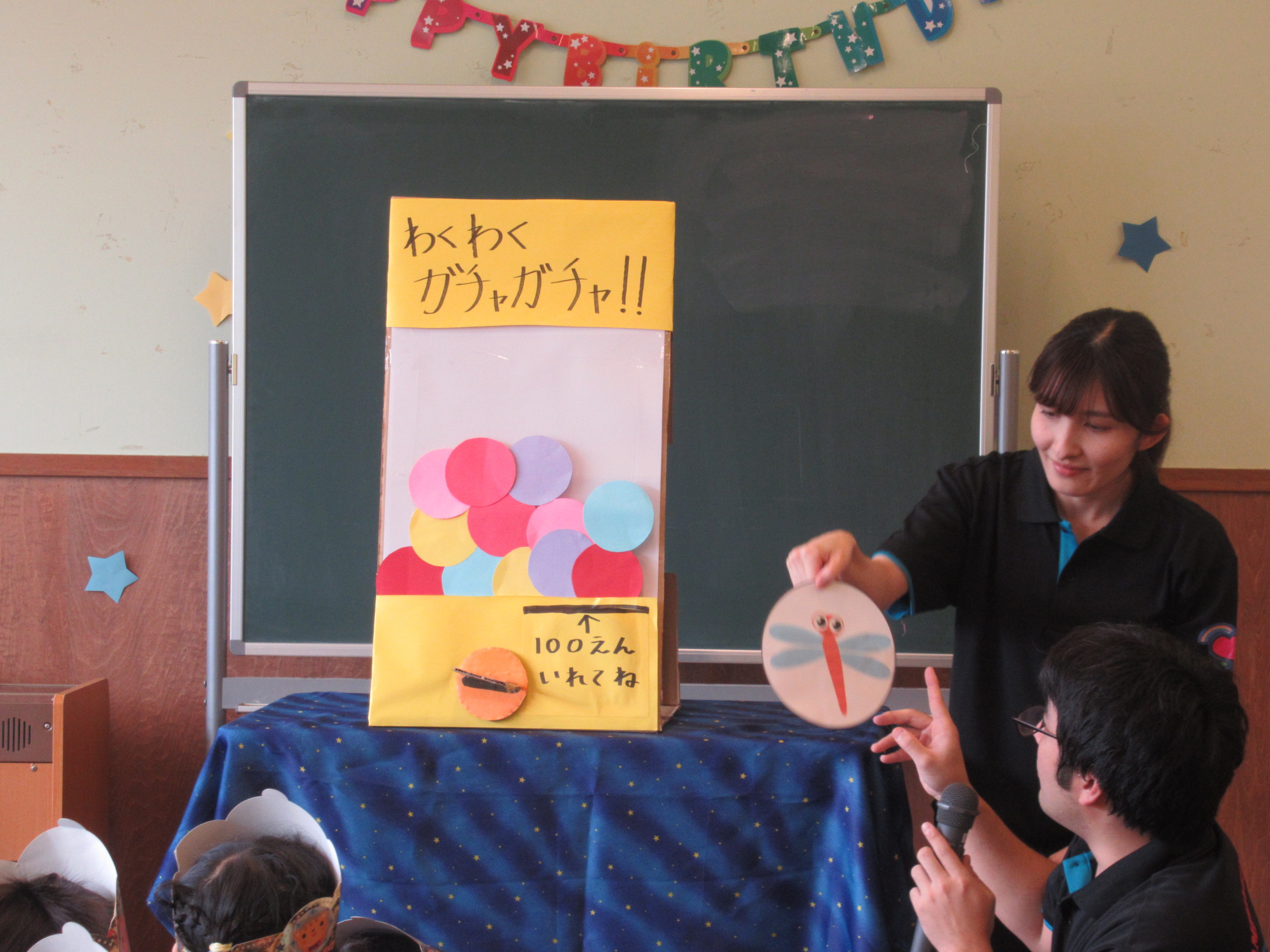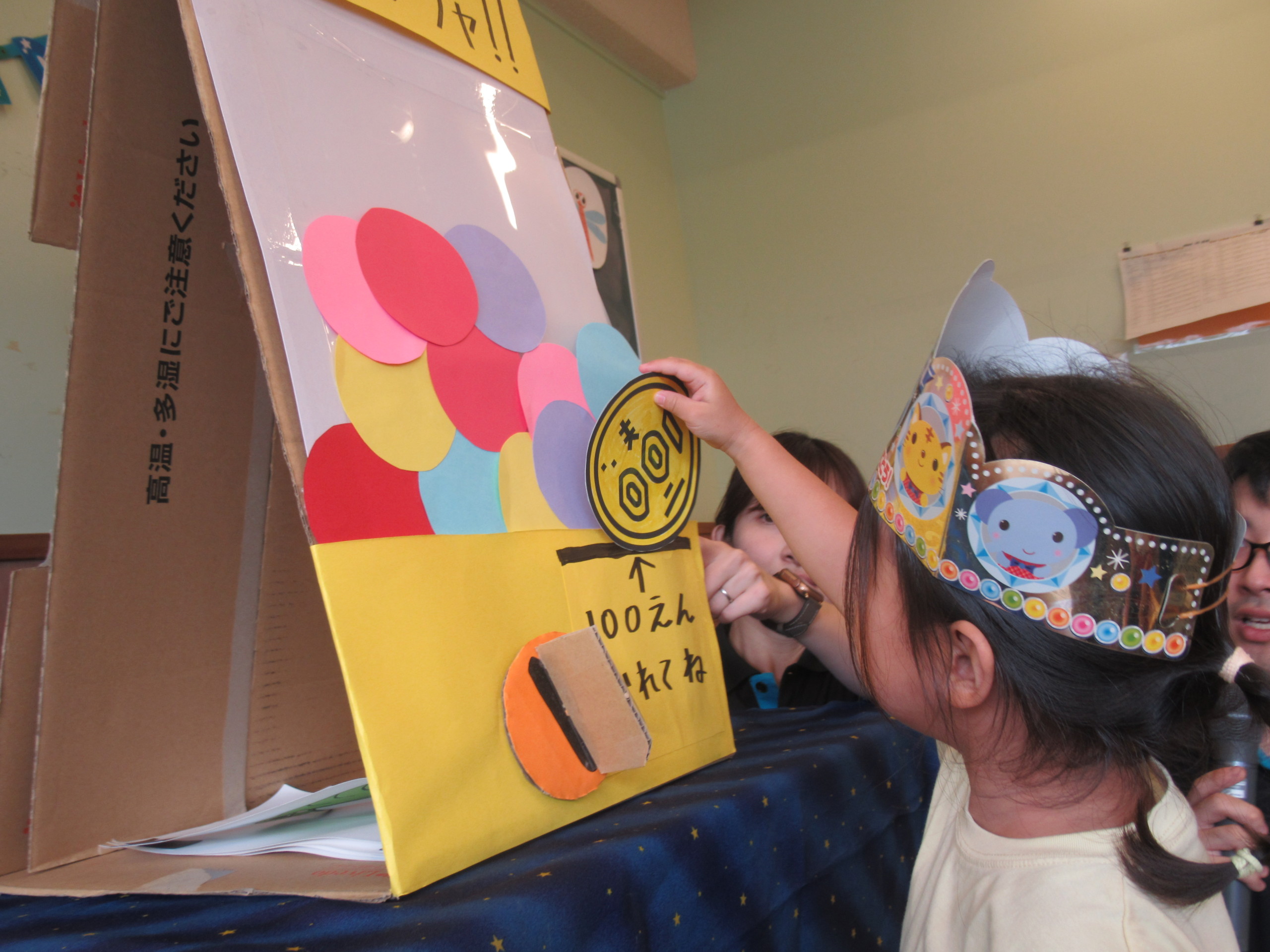 お待ちかねの先生たちからのプレゼントは『わくわくガチャガチャ!』でした!お誕生児のお友だちに100円を入れてもらい、ガチャガチャを回すと…