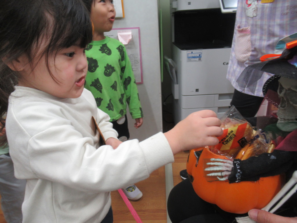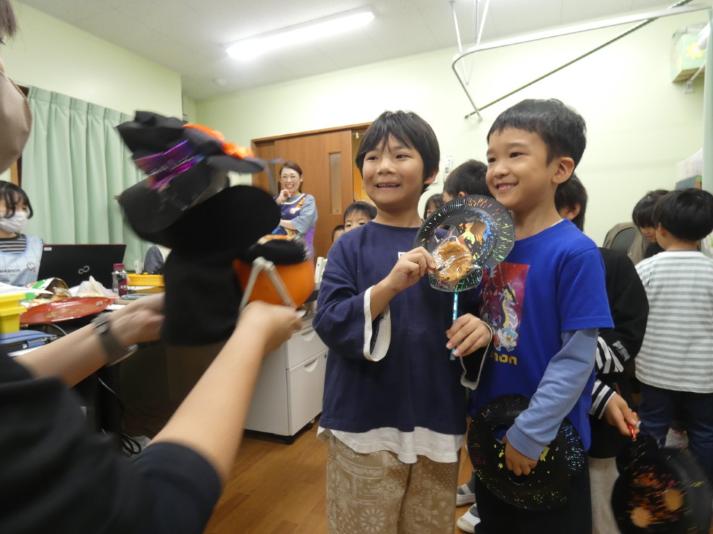 園長先生たちを驚かそうと、「トリックオアトリート!お菓子をくれなきゃいたずらしちゃうぞ!」と言いながら職員室にやってきたお友だち…中に待っていたのは、お菓子を持ったちょっぴり怖いガイコツさんでした!目を光らせながら動く様子にドキドキしながらも、自分で手を伸ばしてお菓子をGET✨ホッとしたような、嬉しそうな笑顔を浮かべていました☺