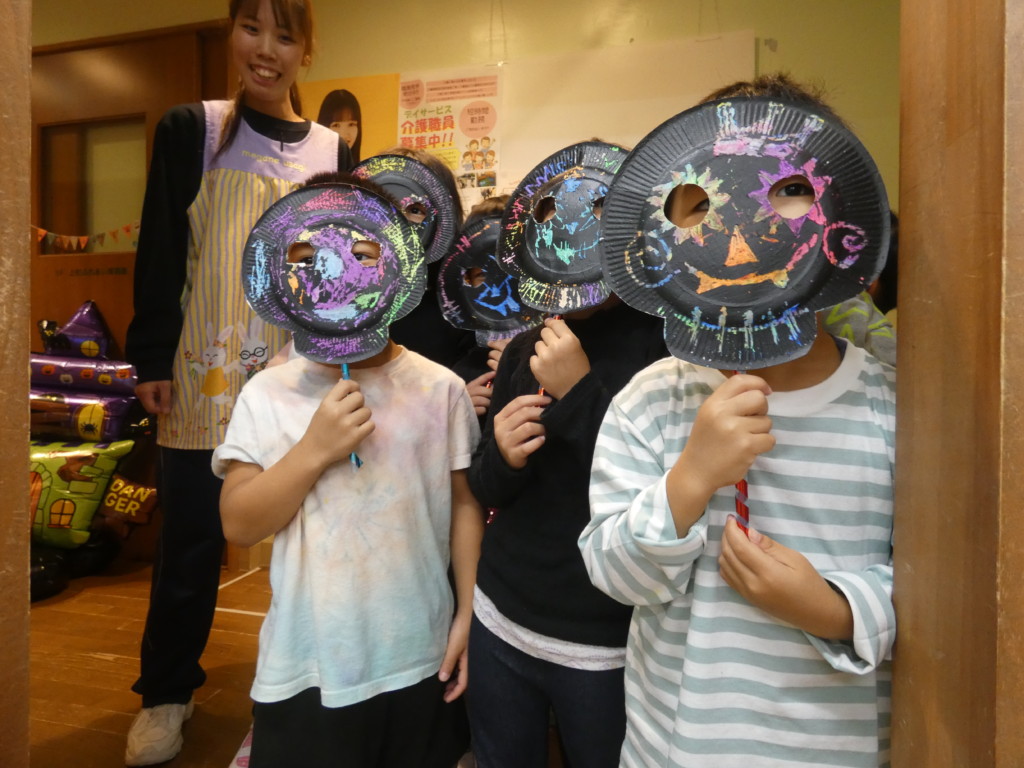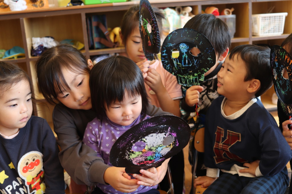 31日はハロウィン当日👻大きいクラスのお友だちが、小さいお友だちを驚かしに来てくれました👀!「おばけがきた!」「こわ~い」と言いながらも嬉しそうです💕お面を貸してもらったり、一緒に写真を撮ったりして楽しみました!