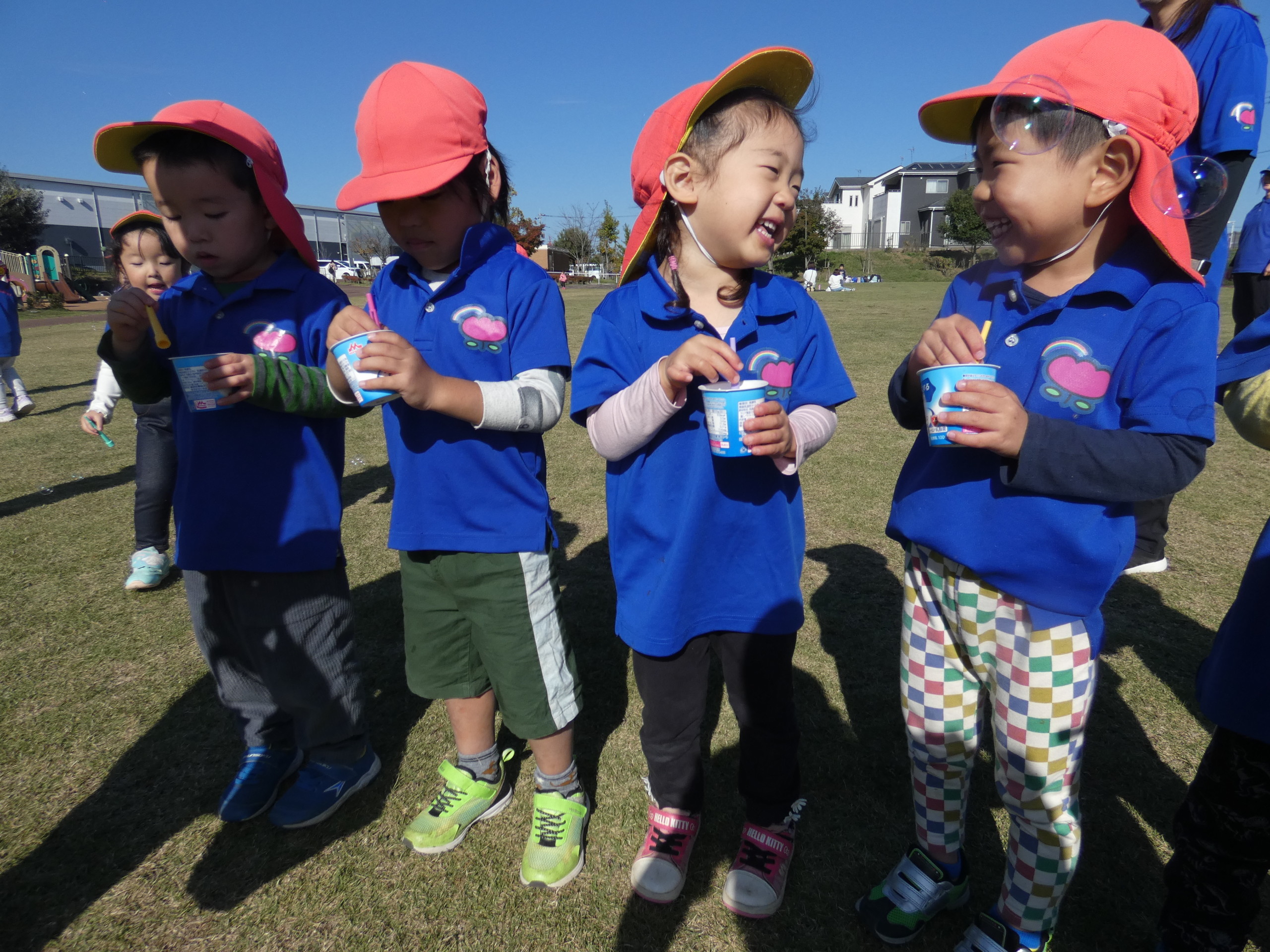 みんなで1列になり ”ふ~”と吹くと青空に綺麗なしゃぼん玉が!子どもたちも「きれーい!」と大興奮!!お友だちと嬉しそうに笑い合う姿がかわいいですね♡
