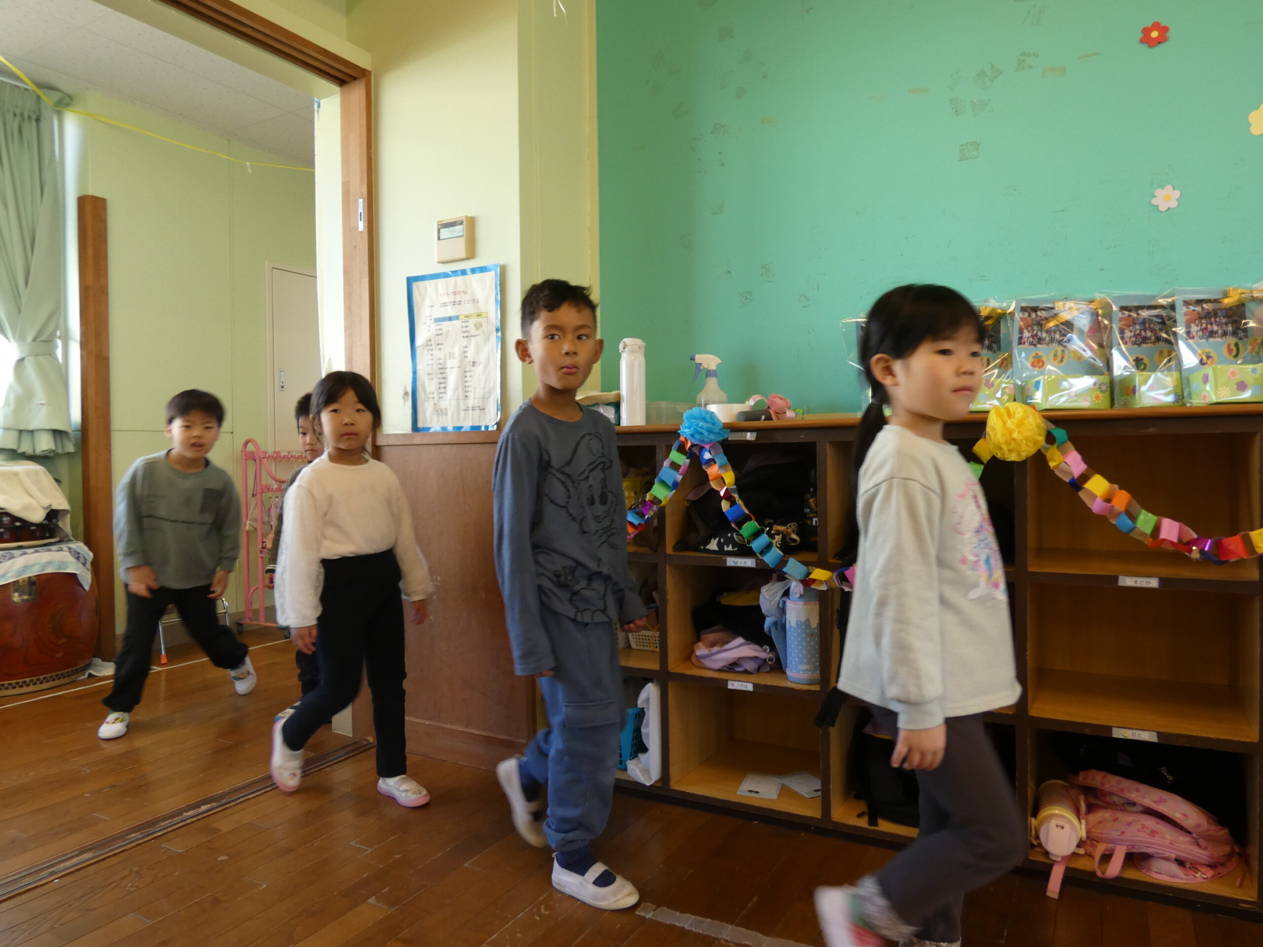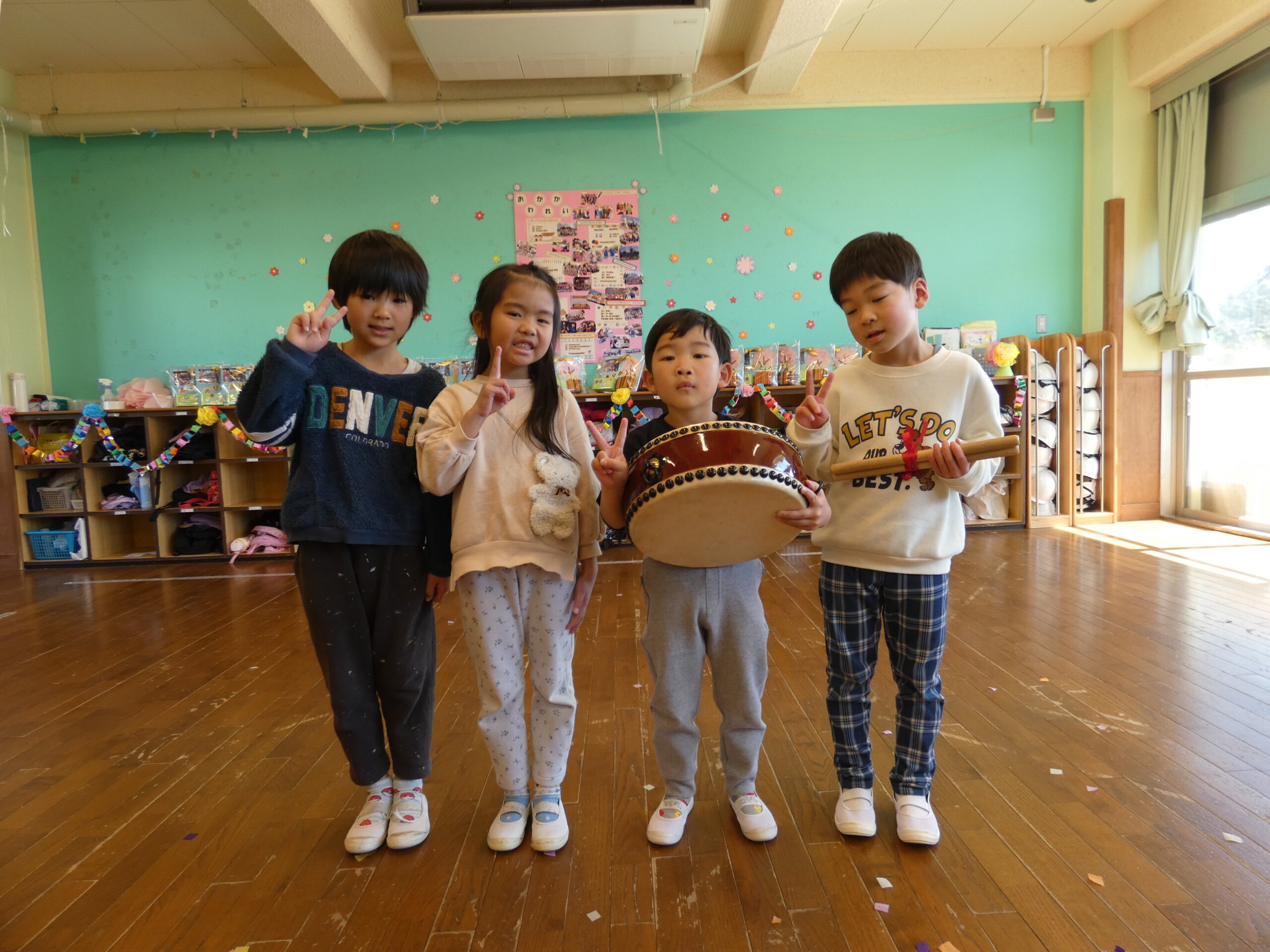 そして、ぞう組伝統の和太鼓も、いよいよ次はぱんだ組さんの番です。太鼓とバチの受け継ぎを行いました✨最後には園長先生からのお話も聞きましたよ👂「さみしいけど、小学校に行っても頑張ってね」と言われ、思わず涙ぐむ様子もありました。とてもあたたかく、素敵なおわかれ会になりました!