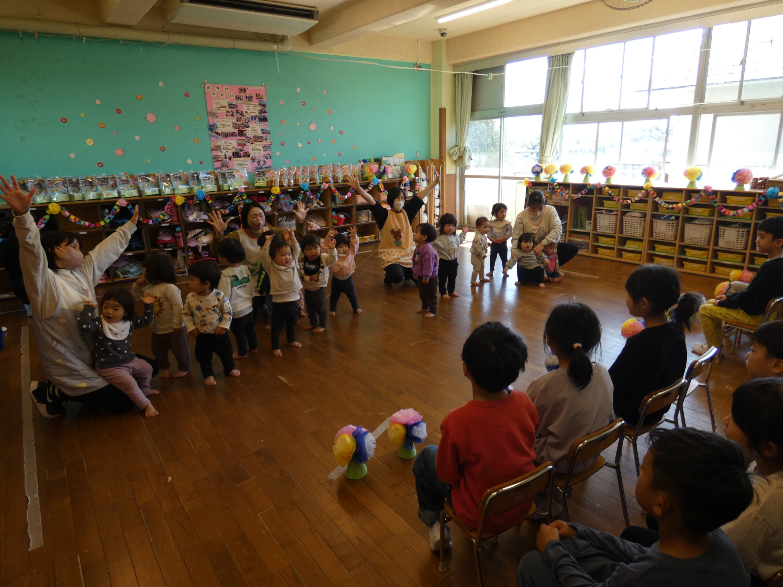 ひよこ組さん~ぱんだ組さんのお友だちは、クラスごとに元気いっぱいのお遊戯や歌を披露しました🎶ぞう組さんも手拍子や歌で盛り上げてくれましたよ😄💗
