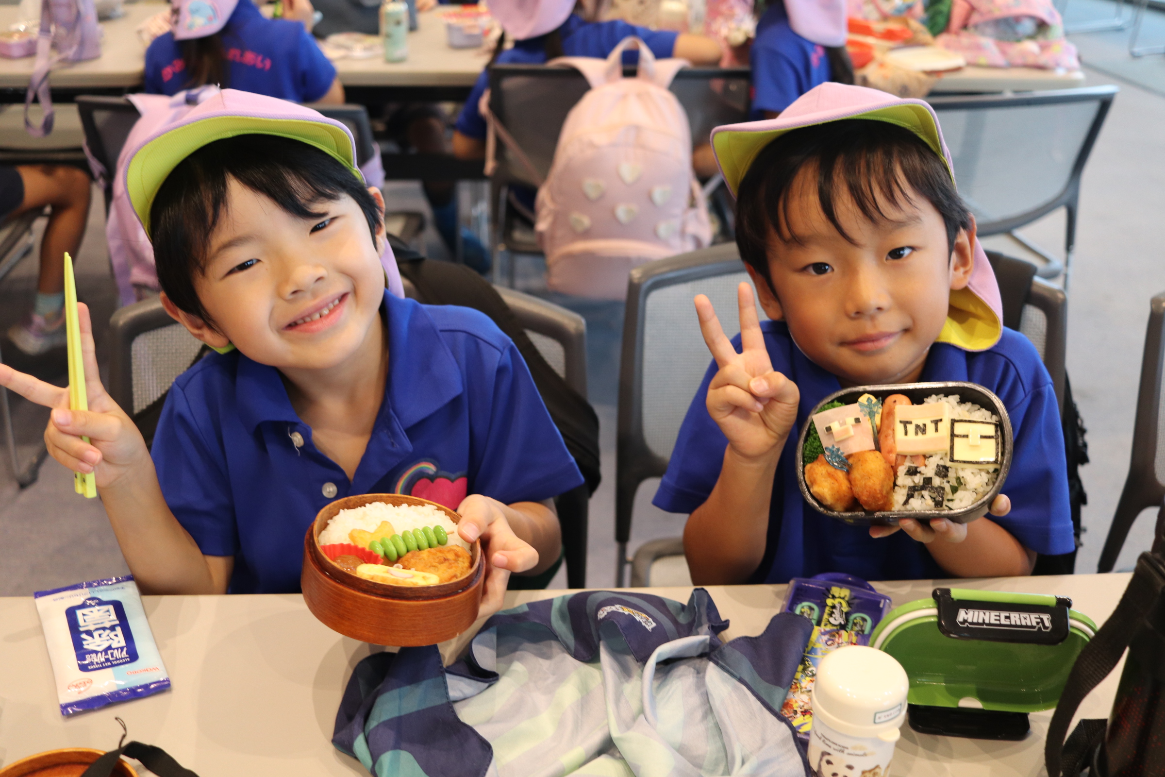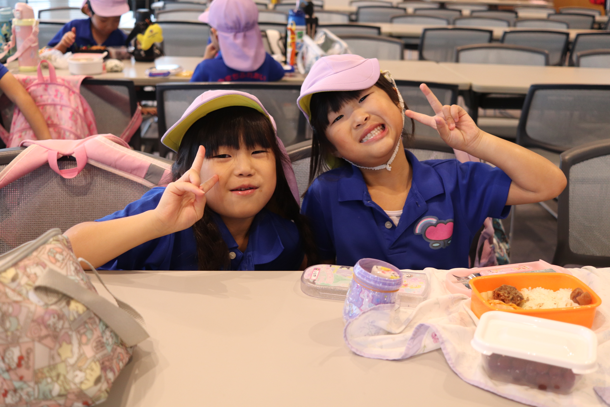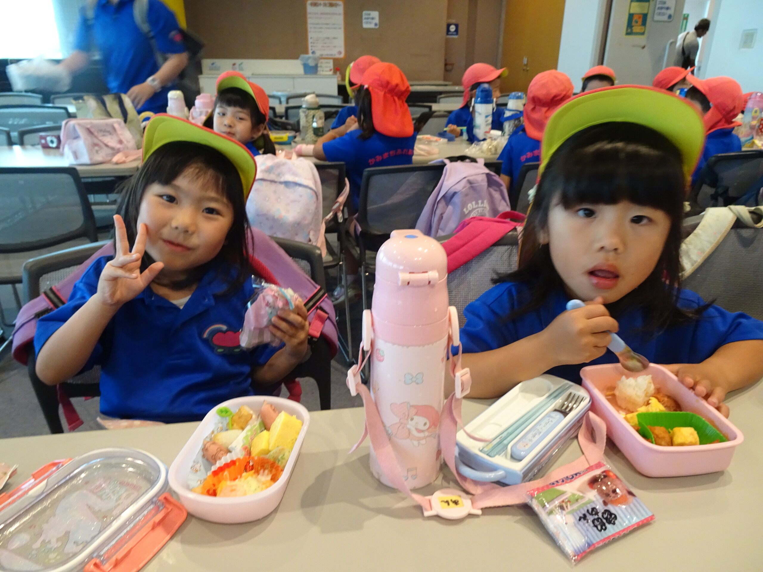 お待ちかねのお弁当の時間です🍱おうちの方が愛情込めて作ってくれたお弁当を、「かわいい~!」「好きな物たくさん入れてもらったんだ✌」とお友だちと見せ合いっこしながら、楽しい時間を過ごしていました😊