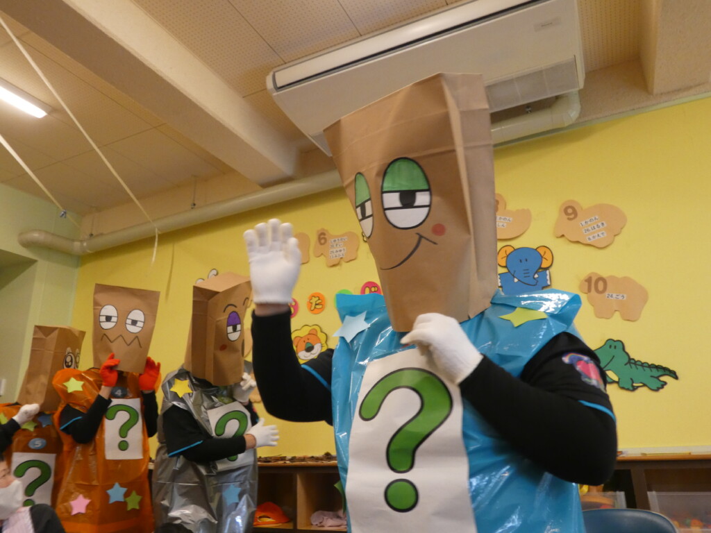 今月のお楽しみは「先生みーつけた♡」でした!同じ格好をしてお面をつけた先生たちが登場すると「え?」「だれだれ~」と大興奮で手を振っていましたよ👋「好きな食べ物は何ですか?」のインタビューに答えてもらったり、ダンスを踊ってもらい「○○先生かなー?」とみんなで予想しました。「○○先生!」と大きな声で呼んで答え合わせをすると、なんと全問正解!さすがです✨中から大好きな先生たちが出てくると「やっぱりー」と嬉しそうでしたよ♡