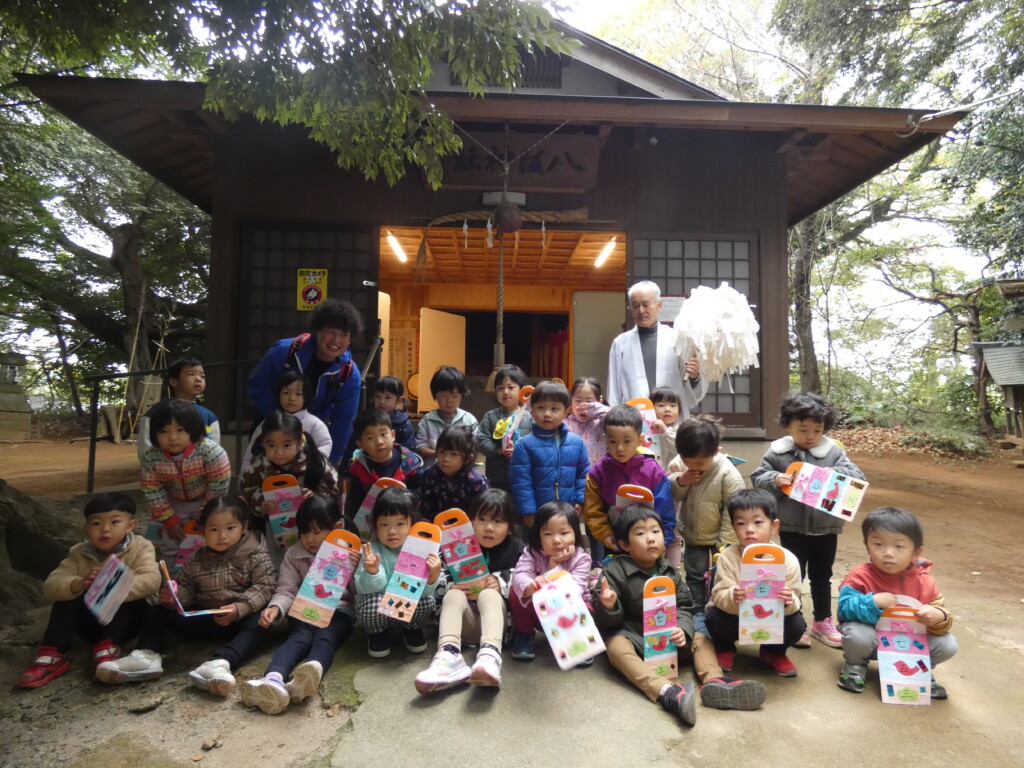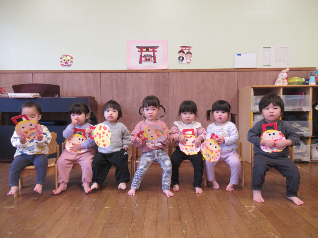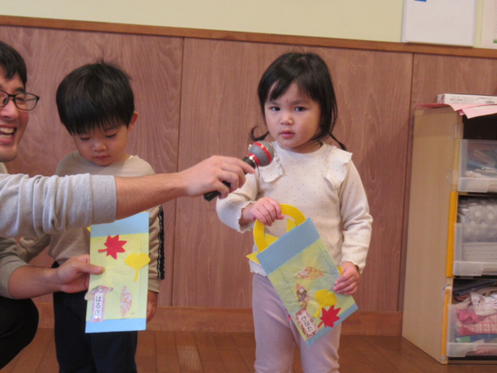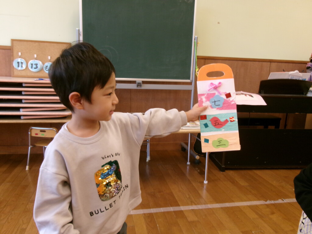 小さいクラスのお友だちも神社へ行く予定でしたが、雨の心配があったためお部屋の中で七五三の由来などのお話を聞きましたよ!お話を聞いたあとは、各クラス代表のお友だちが千歳飴袋の紹介をしてくれました!神社のイラストの前で参拝もしてみましたよ♪