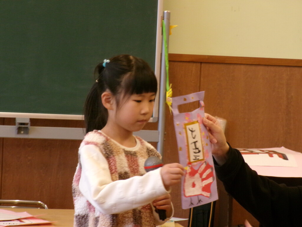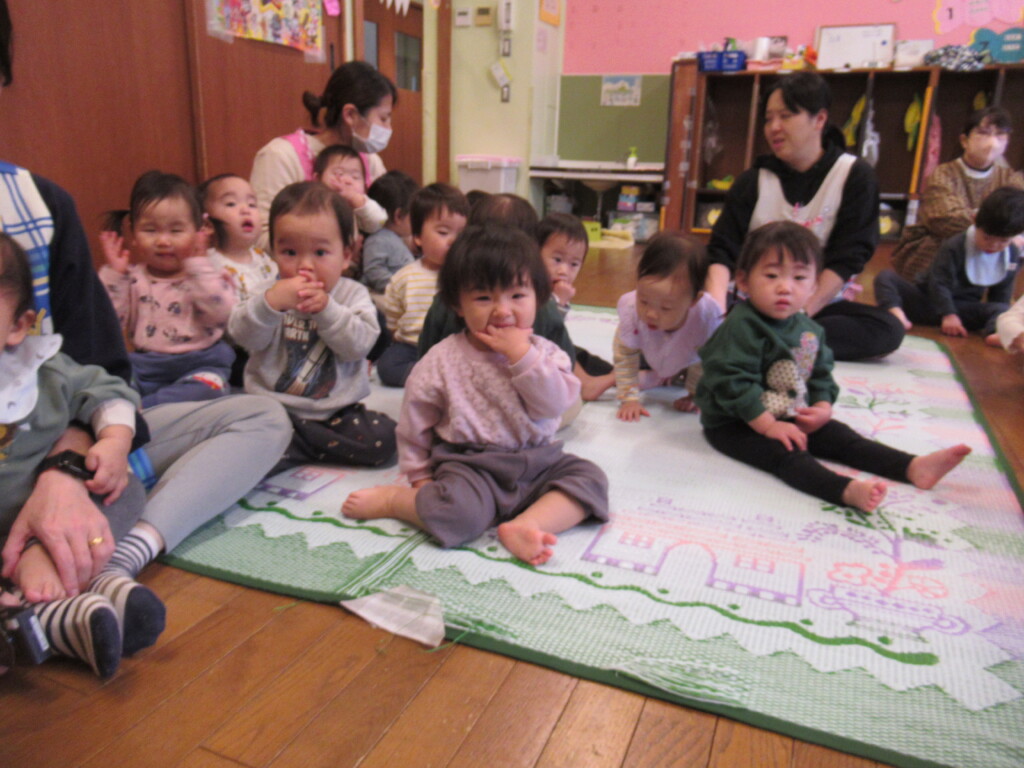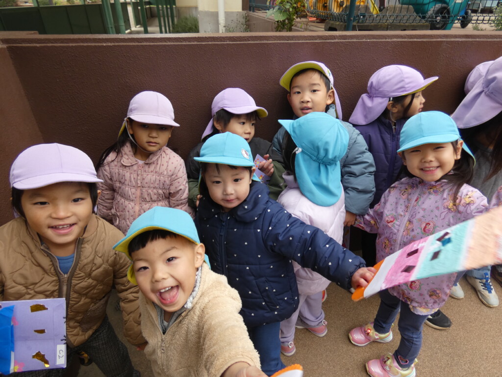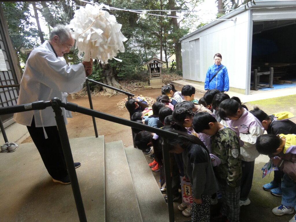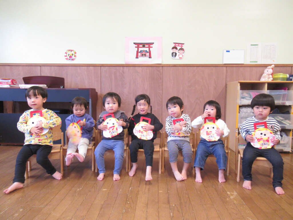 小さいクラスのお友だちも神社へ行く予定でしたが、雨の心配があったためお部屋の中で七五三の由来などのお話を聞きましたよ!お話を聞いたあとは、各クラス代表のお友だちが千歳飴袋の紹介をしてくれました!神社のイラストの前で参拝もしてみましたよ♪