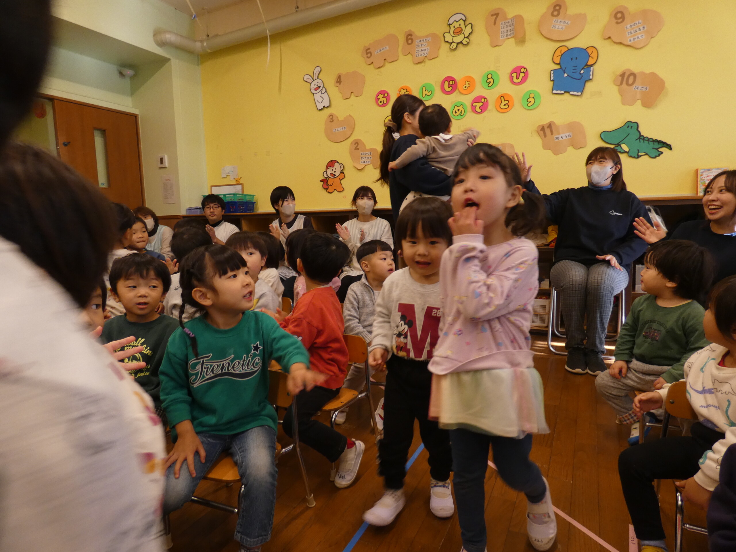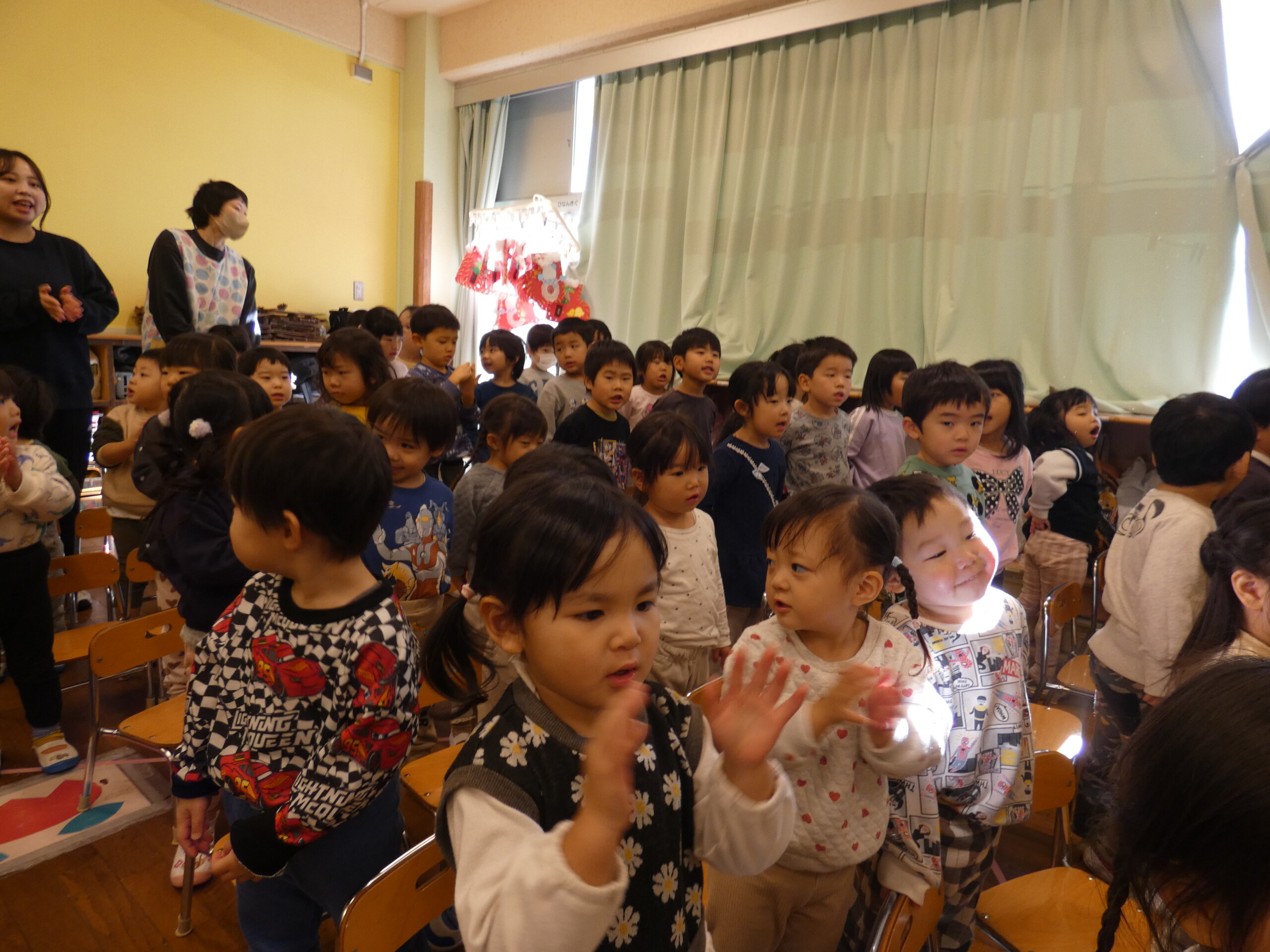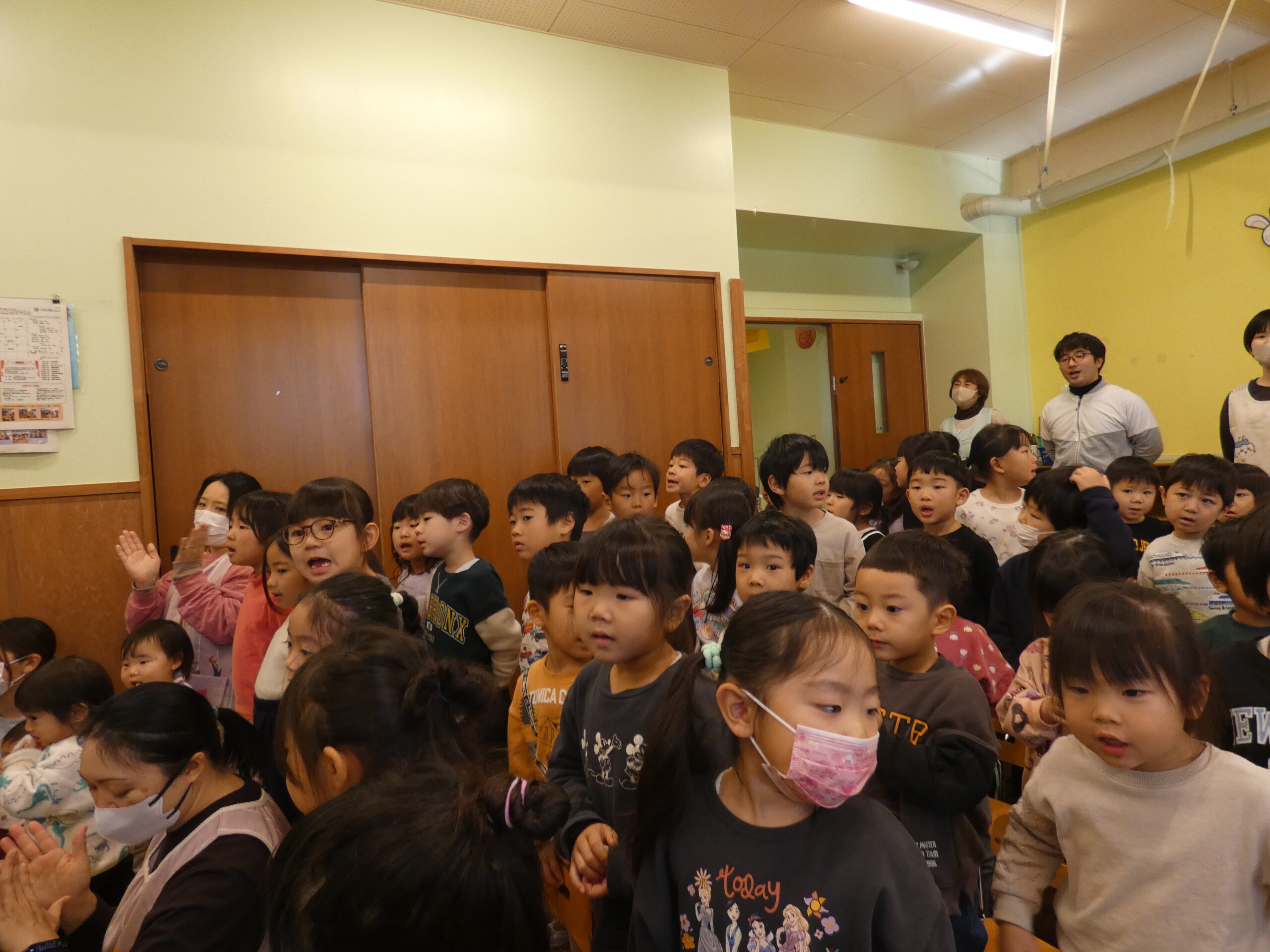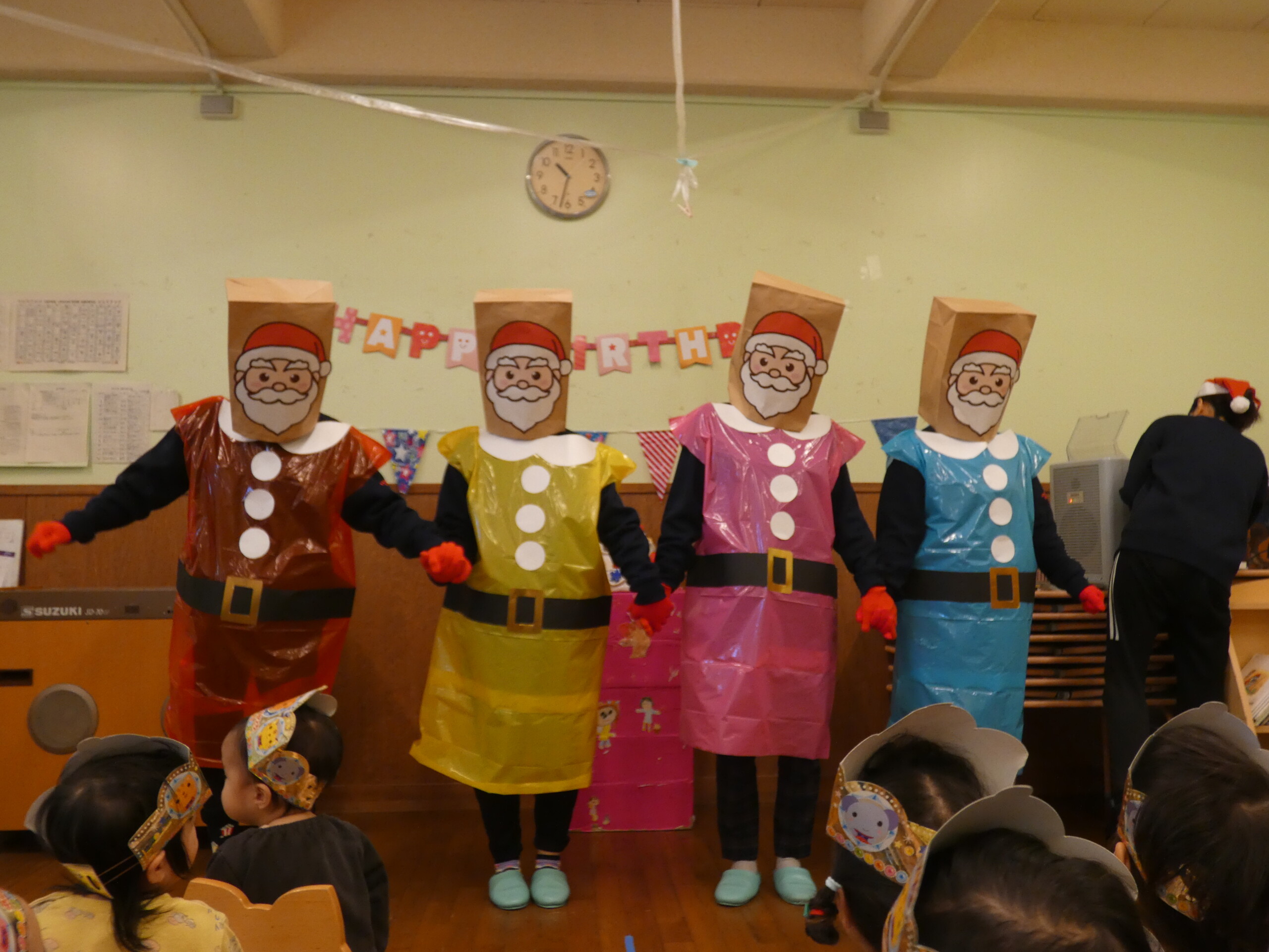 今日のお楽しみは…『先生みーつけた♡~クリスマスVer.~』でした!サンタクロースに変装した4人の先生が登場✨それぞれの先生が出す面白い声やダンスで、「だれ先生だろう?」と大笑いしながら予想するお友だち!お面を外すと「○○先生かぁ~!」と大喜びでしたよ🥰
