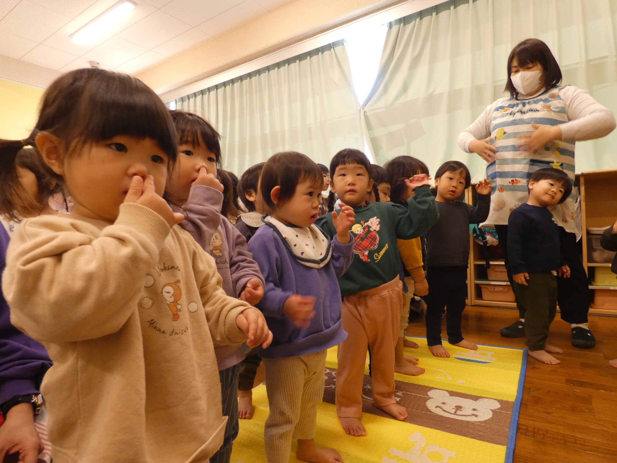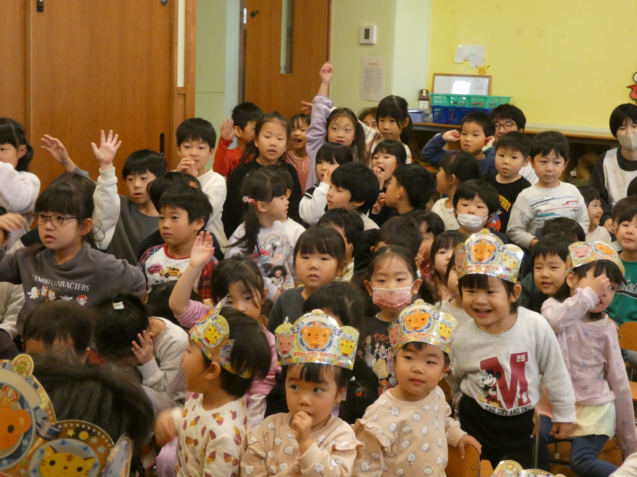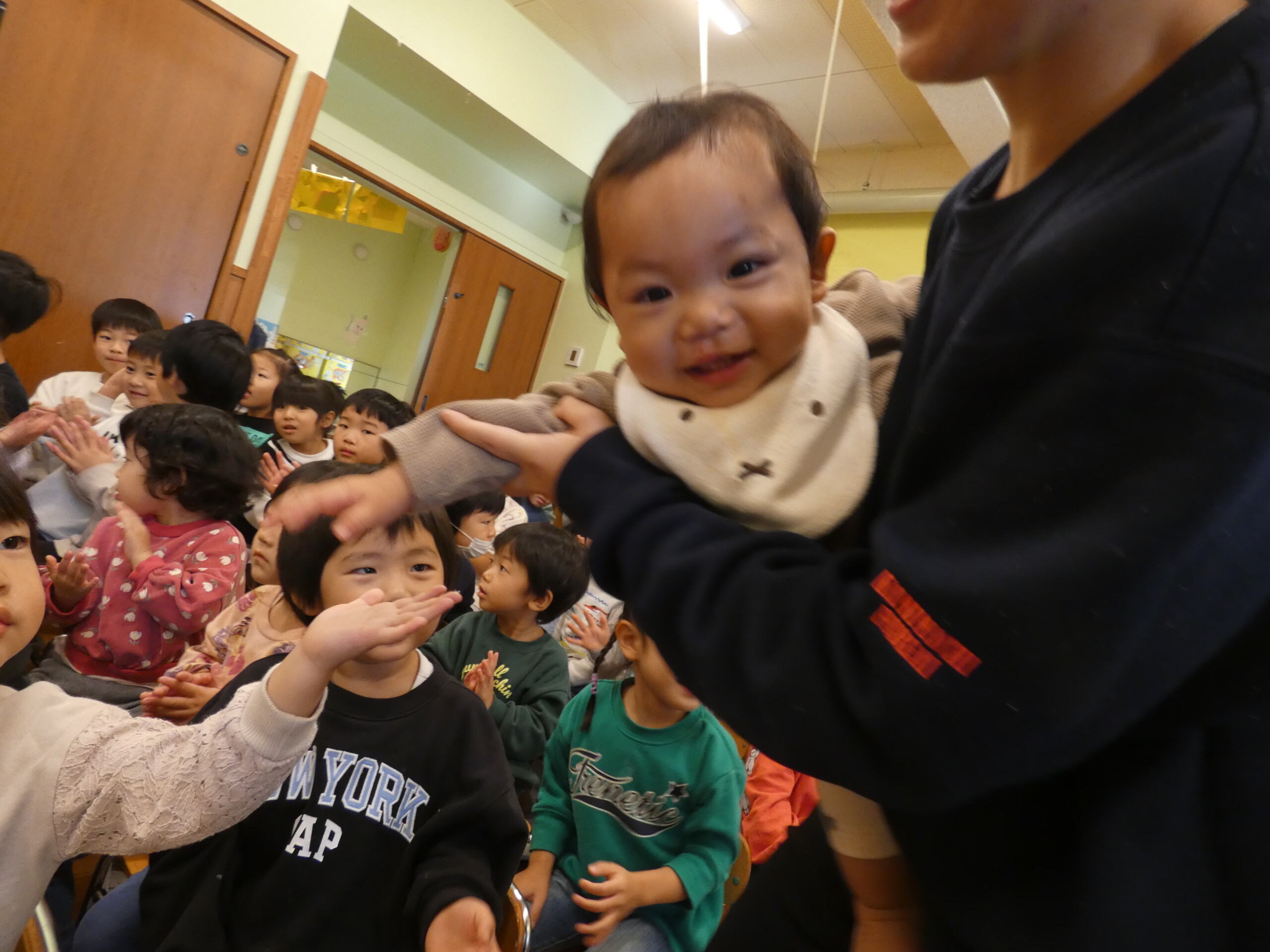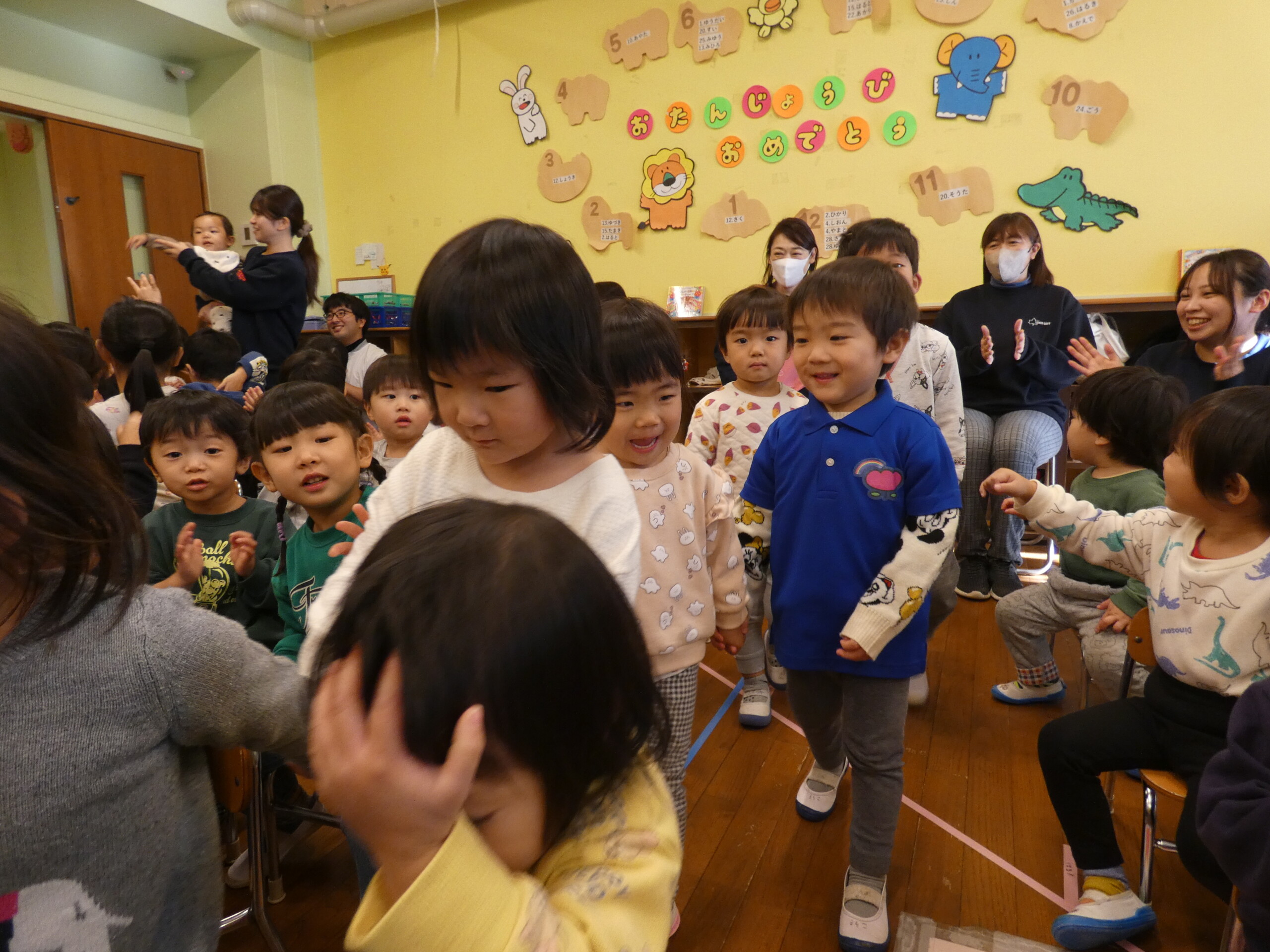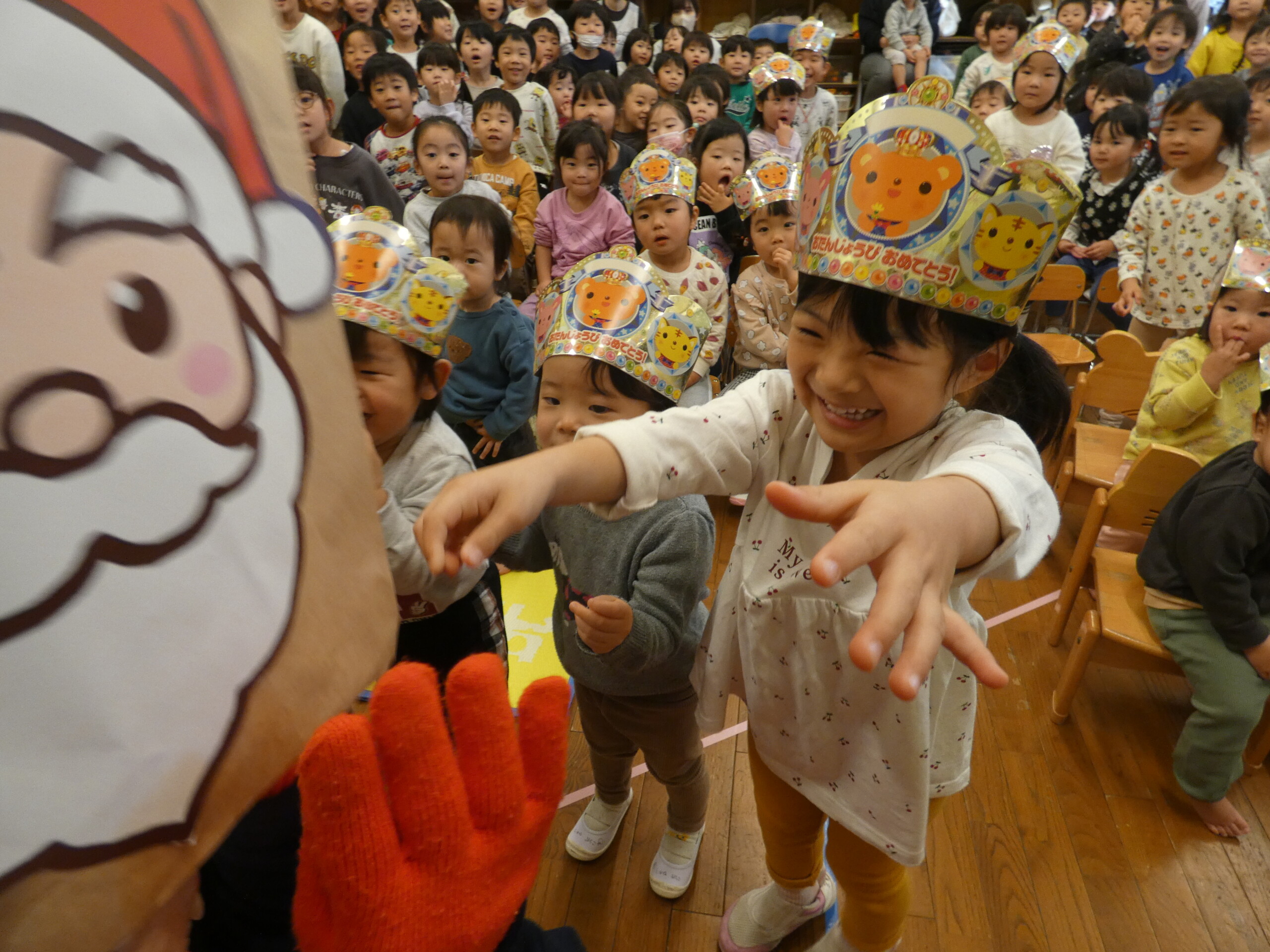 今日のお楽しみは…『先生みーつけた♡~クリスマスVer.~』でした!サンタクロースに変装した4人の先生が登場✨それぞれの先生が出す面白い声やダンスで、「だれ先生だろう?」と大笑いしながら予想するお友だち!お面を外すと「○○先生かぁ~!」と大喜びでしたよ🥰