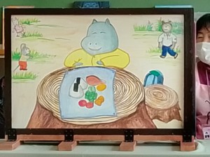 紙芝居では、遠足の日に朝ご飯を食べなかったカバくんが疲れて歩けなくなってしまう
