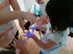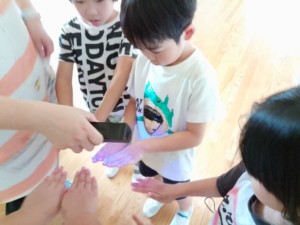 手洗いした後特殊ライトで照らしてみると洗い残しがいっぱい・・・・・・・