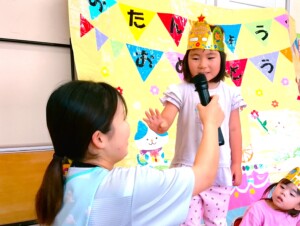 保育園でみんなから「おめでとう!」と祝ってもられる誕生会。誕生児の子どもたちはとても喜んでいます。まだ誕生日が来ていないお友達も自分の誕生月をとても楽しみにしています。