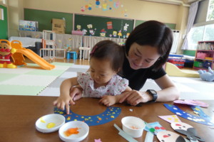 シール貼りや絵の具での指スタンプをして、星空や、織姫・彦星のお顔を作りました。小さいシールも上手に貼っていましたよ🎵