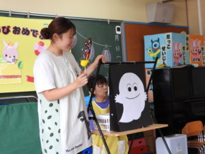 先生からの出し物は、ばけたくんの「スケッチブックシアター」です!