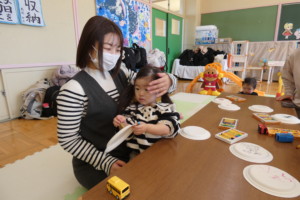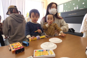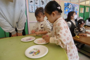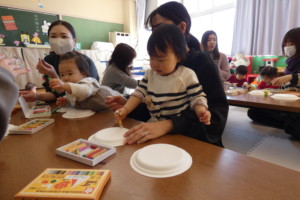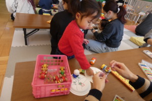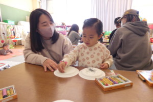 まずは、紙皿にクレヨンでお絵描きしたりシールを貼ったり、画用紙とは違う感触を楽しみながら自由に製作していました。二枚の紙皿を重ねて中に鈴やビーズを入れてホチキスで留めたら完成!!お母さん達が、ホチキス部分にテープを貼ってるそばからそれをぺりぺり剝がして楽しむお子さんも・・・(笑)。 シールは貼るのも剝がすのも楽しいですよね☆