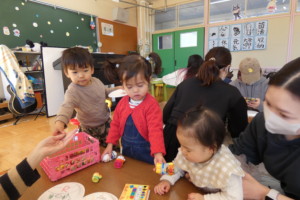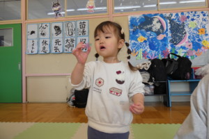 タンバリンが完成したら演奏会が始まりますよ~!!「おおきなたいこ」や「おもちゃのチャチャチャ」を、自分で作ったタンバリンで合奏しました。今日初めて演奏したとは思えないくらい上手!!叩いたり振ったりして、音を楽しんでいました。