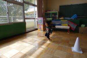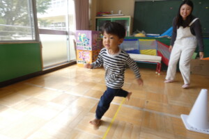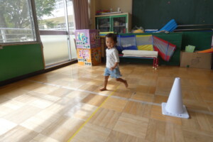 プログラム№2「かけっこ」では、コーンで作ったトラックを一周!