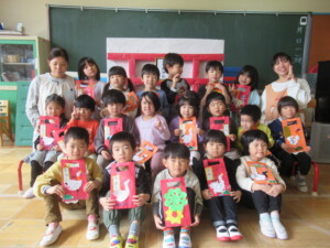 「先生達にも、みんなと同じように子どもの頃があったんだよ」と、職員の七五三写真を使って、「この子(七五三写真)は誰先生でしょうか?」と先生当てクイズも楽しみました。