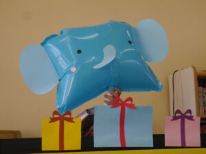 お楽しみは『バルーンシアター』でした。プレゼントの箱からうさぎやぞう、おばけにきりんなどいろいろな動物が誕生会のお祝いに駆けつけてくれましたよ。