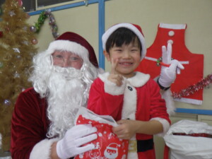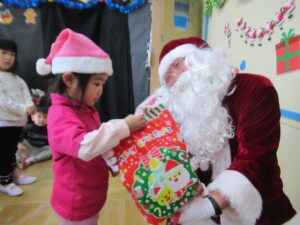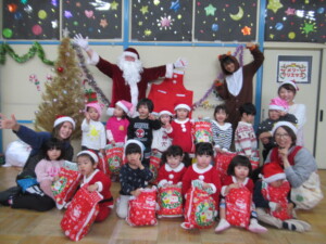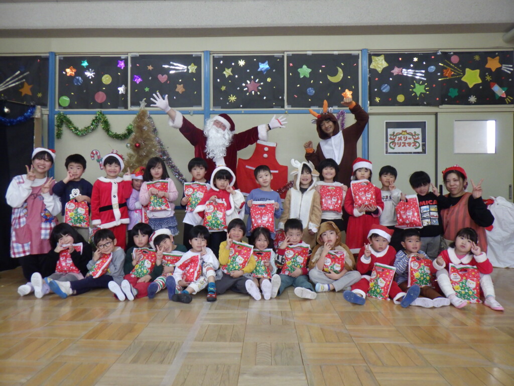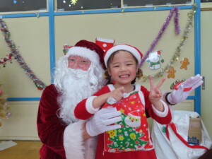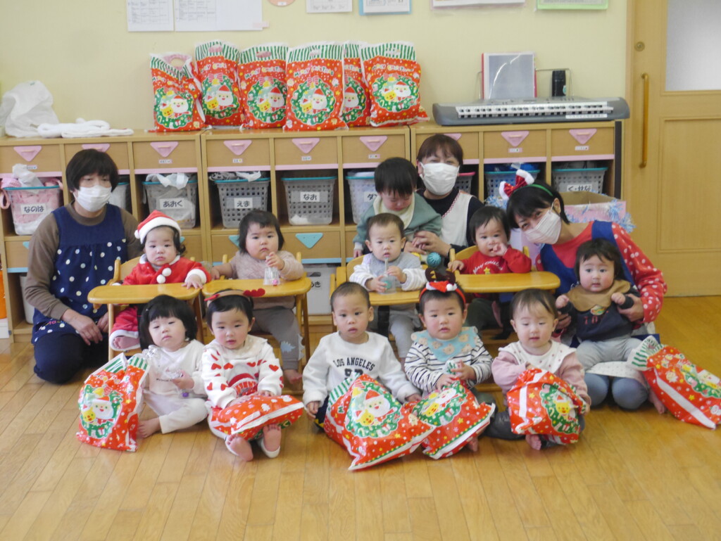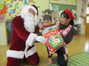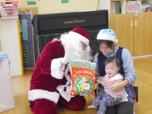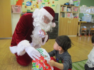サンタさんの登場にびっくりしてしまう子もいましたが、先生と一緒にプレゼントをもらうことができました🌟