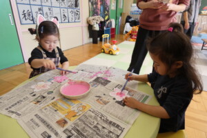 絵本に登場した”しゃぼん玉”をにじみ絵で、”桜の花”をはじき絵で作りました🌸
