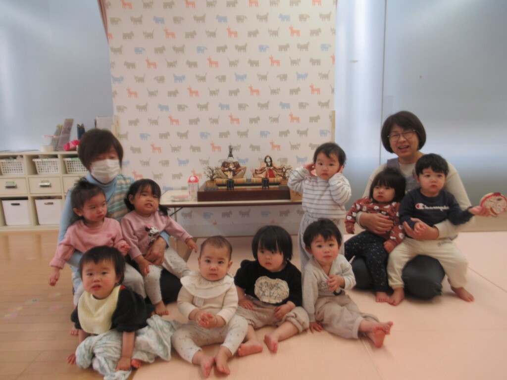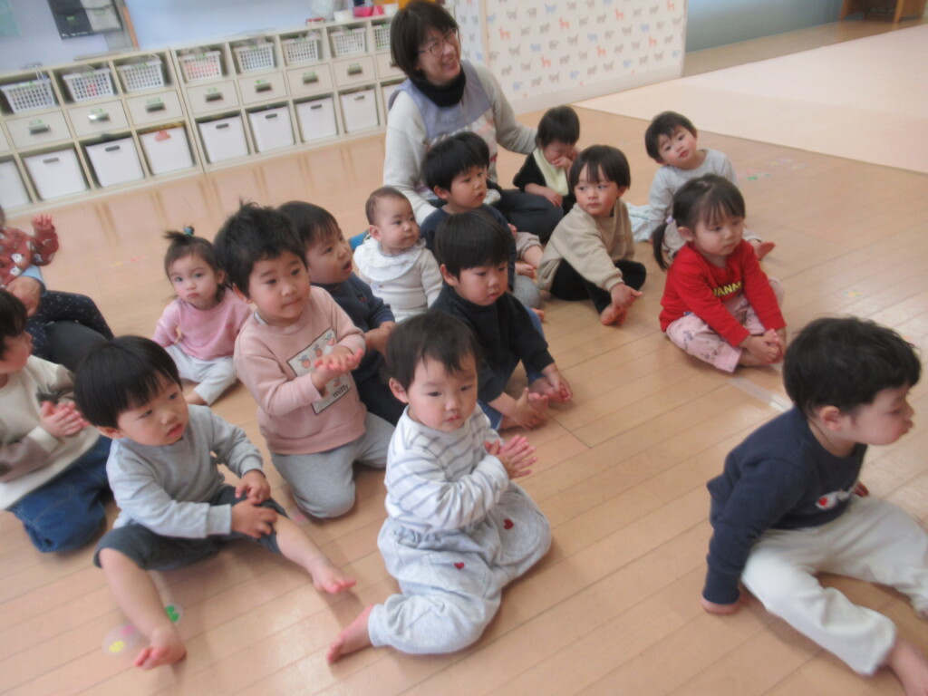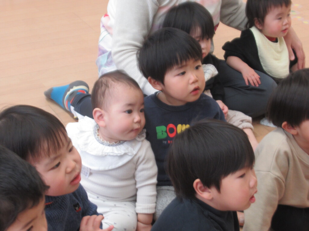 集会の前から「うれしいひなまつり」の曲を流すと、一緒に歌ったり、リズムに乗せて体を揺らして興味深々!